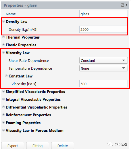 在 Viscosity Law 类别中,输入Viscosity 为 500 Pa。
