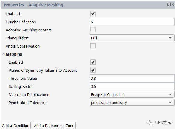 点击节点Setup → Adaptive Meshing → Conditions → condition-1定义自适应网格化条件(condition-1) -