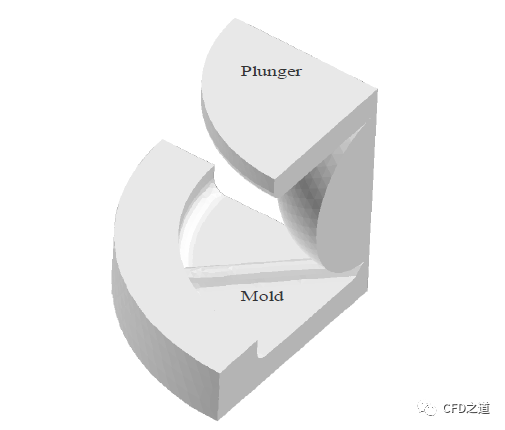 下图展示了初始配置(压制流体前)的几何草图。一块材料置于模具上,在预定时间内,柱塞向下移动以压缩流体体积。鉴于模具与流体团具有对称性,仅模拟了四分之一几何形状。