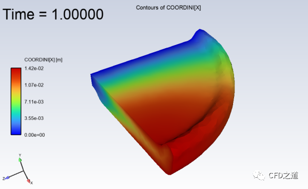重复前面的步骤,在具有名称为 initial-coordinate-x,字段设置为 COORDINI[X],并且禁用了 Use Global Range 选项 的 freesurface,symmetry1,和 symmetry2 表面上创建新的云图。重复前面的步骤以查看云图动画。
