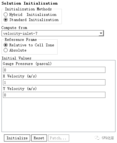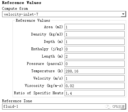 双击模型树节点Reference Values,右侧面板设置Compute from为velocity-inlet-7