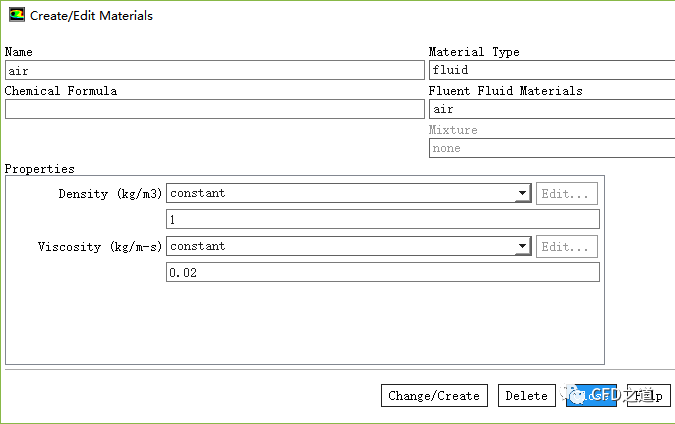 双击模型树节点Materials > Fluid > air,弹出对话框中设置Density为1 kg/m3,设置Viscousity为0.02 kg/m-s