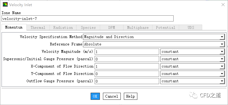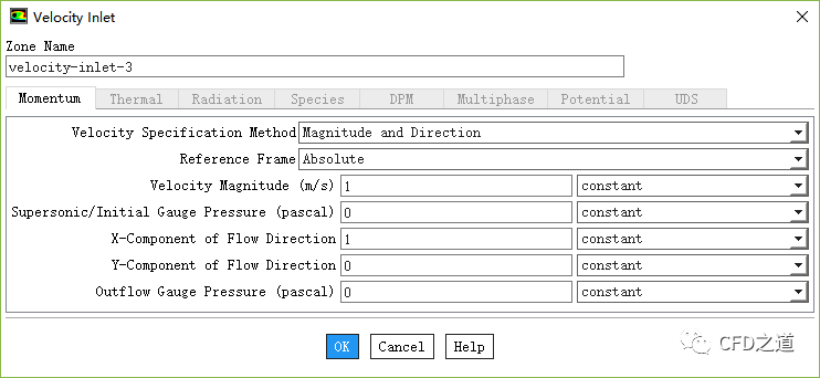鼠标双击模型树节点Boundary Conditions > velocity-inlet-3,弹出对话框中设置Velocity Magnitude为1 m/s