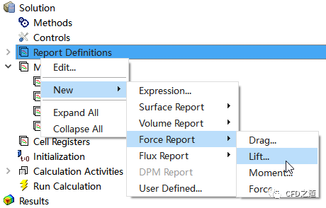 右键选择模型树节点Report Definitions,选择弹出菜单项New → Force Report → Lift,弹出升力系数定义对话框