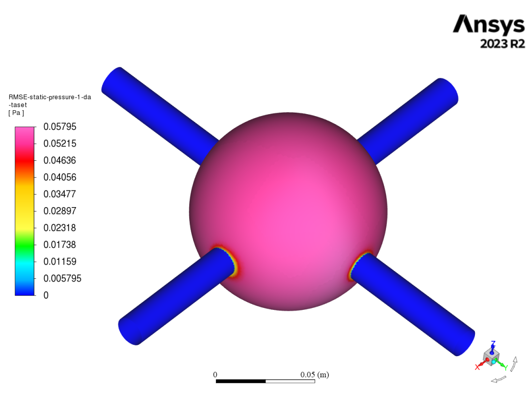 对于未选中的区域,其数据统计结果一律为 0。如下图所示,在数据集设置中仅包含中心的球面,不包含四个圆柱面,因此后处理云图中圆柱面的数值为 0。