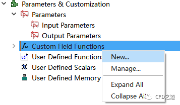 右键选择模型树节点Parameters & Customization > Custom Field Functions,点击弹出菜单项New…打开设置对话框