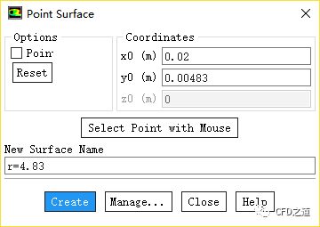 对话框中设置x0为0.02 m,y0为0.00483m,命名为r=4.83,点击Create创建点