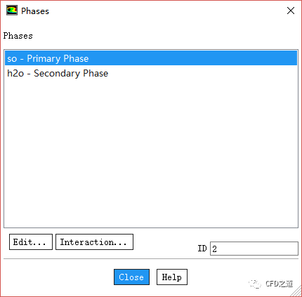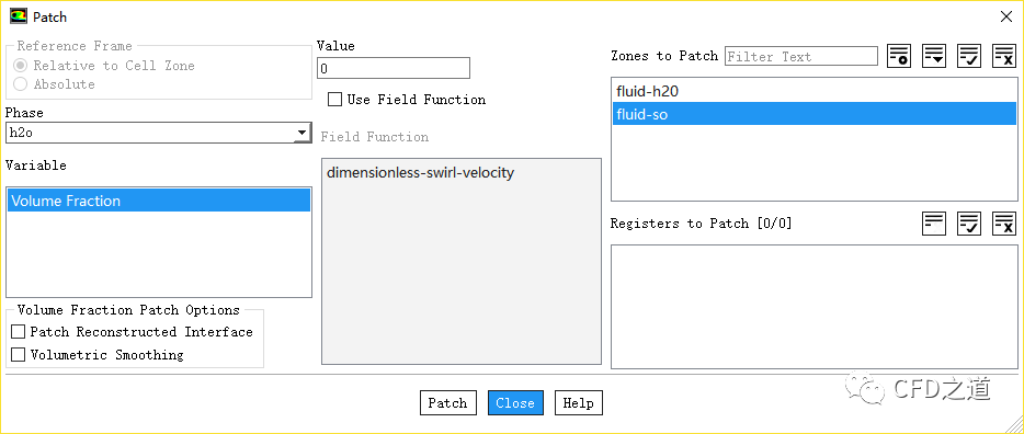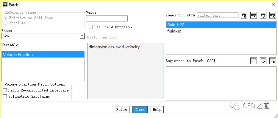 点击Patch...按钮,弹出对话框中初始化区域fluid-h2o的第二相体积分数为1