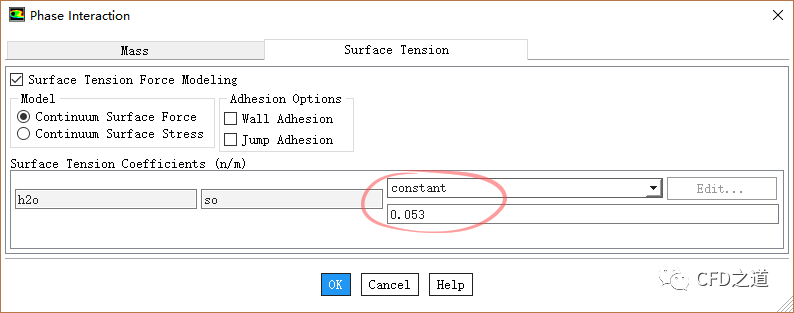 点击按钮Interaction…弹出相间相互作用设置对话框,切换至Surface Tension标签页,设置表面张力系数为0.053