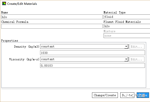 添加材料h2o,设置其Density为1030 kg/m3,设置其Viscousity为0.00103 kg/m-s,如下图所示
