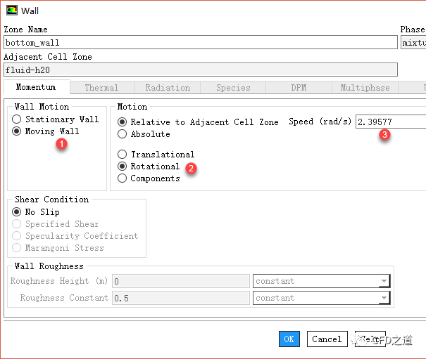 双击模型树节点Bottom_wall,弹出设置对话框中,按下图所示设置其旋转速度为2.39577 rad/s