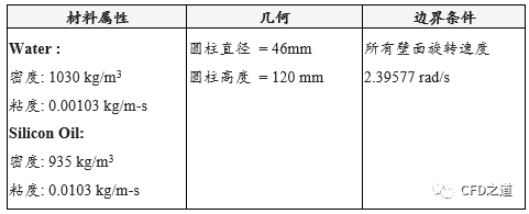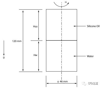 一个竖直放置的圆柱形密闭容器,其中盛装有不相溶的两种介质(水和硅油),其中硅油密度较小位于容器上部,水位于容器下半部。容器以恒定角速度旋转,如下图所示。本案例利用Fluent模拟容器旋转后水及硅油间的分界面。