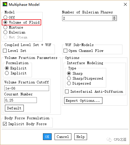 双击模型树节点Models > Multiphase,弹出多相流设置对话框