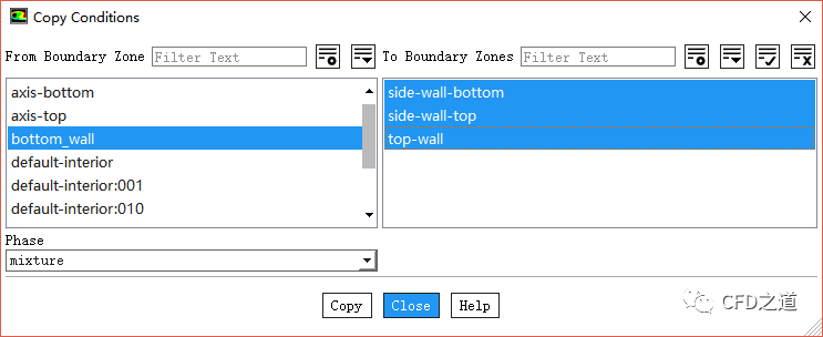 双击模型树节点Boundary Conditions,点击右侧面板按钮Copy…弹出边界复制对话框,如下图所示将边界bottom_wall数据拷贝到其他壁面边界