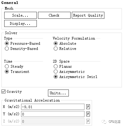 双击模型树节点General,右侧面板激活选项Transient、Axisymmetric Swirl