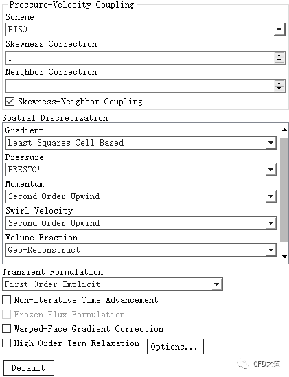 鼠标双击模型树节点Methods,右侧面板设置压力速度耦合算法为PISO