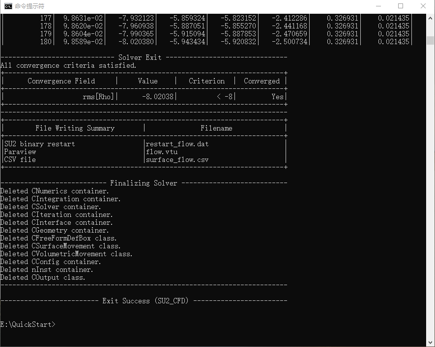 在命令行输入 SU2_CFD inv_NACA0012.cfg,运行可执行文件。如果没有设置适当的环境变量,可能需要在命令行中指定 SU2_CFD 可执行文件的路径。