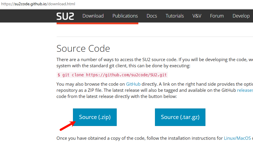 从SU2官网直接下载(https://su2code.github.io/download.html)源代码。如下图所示,将Source.zip文件下载到本地并解压。