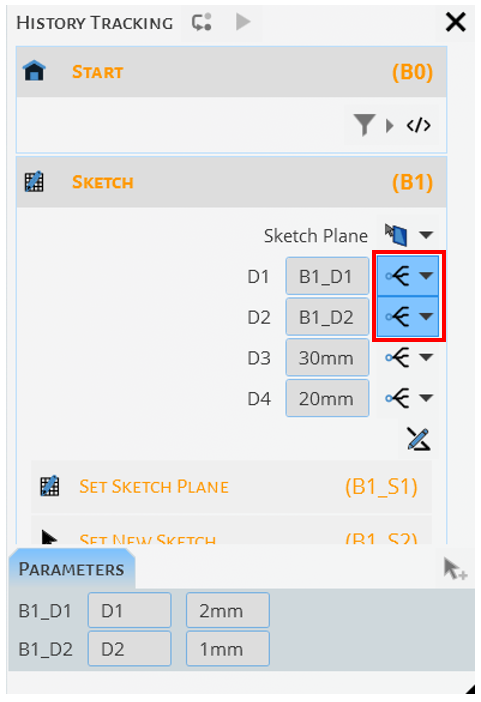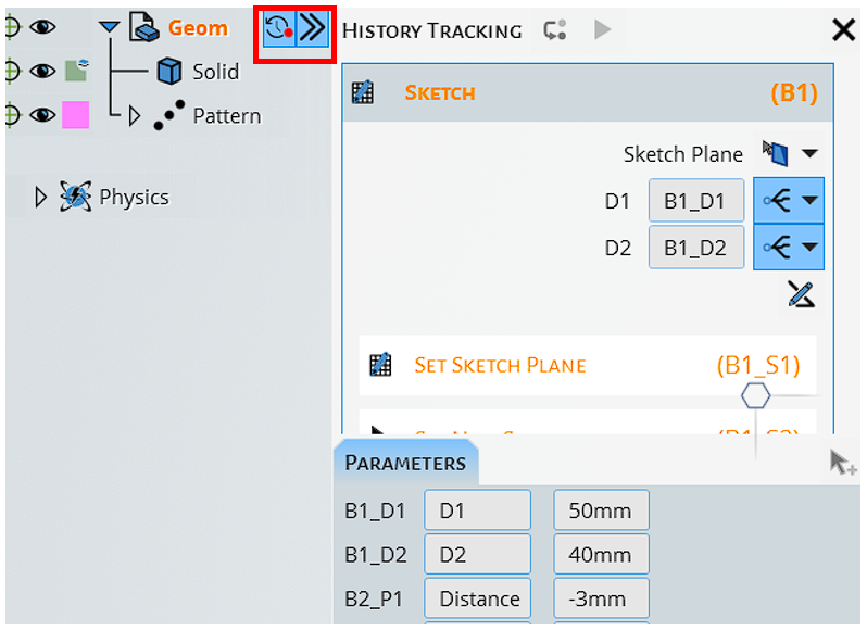 历史追踪界面中记录了各步骤的设置信息。点击参数化按钮,可将操作设置参数化。