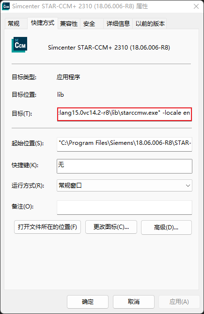 以英文界面打开STAR CCM+。右键选择STAR CCM+快捷菜单,选择 属性 后打开设置对话框,如下图所示,在 目标后添加命令选项 -locale en ,点击 确定