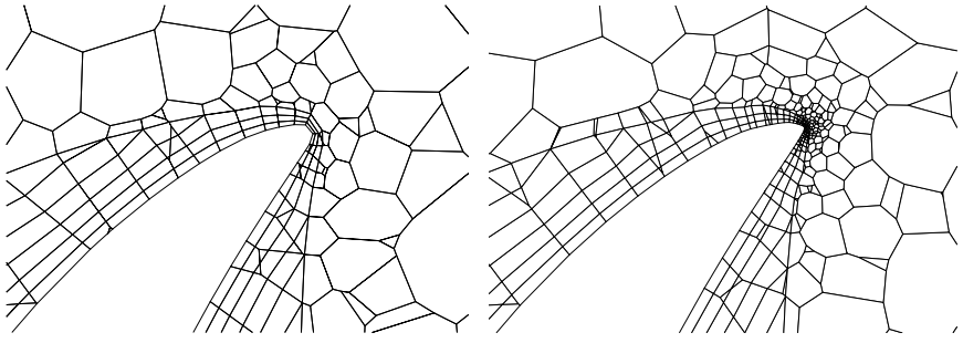 图12.7 计算网格中螺旋桨叶片前缘的分辨率:壁切线方向的网格太粗(左),导致前缘拐角粗糙,而通过局部细化得到了改善(右)