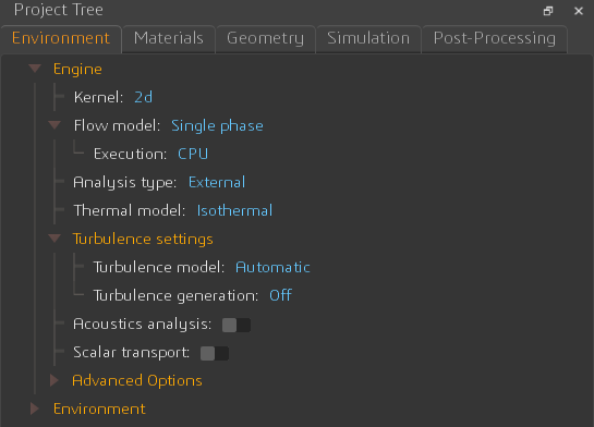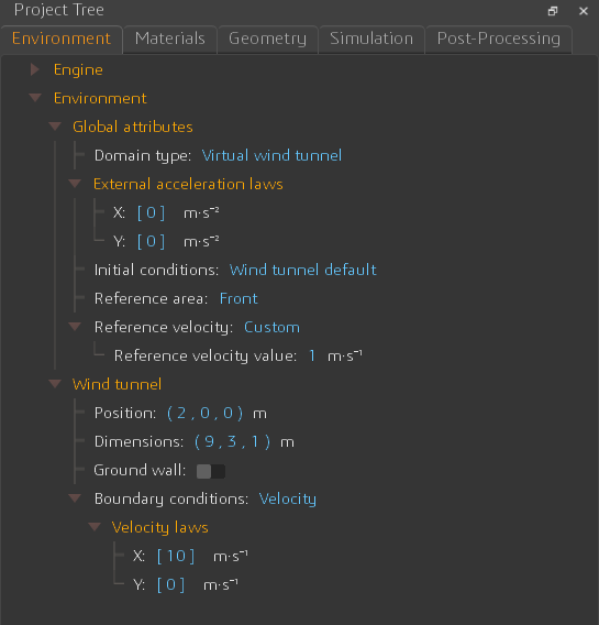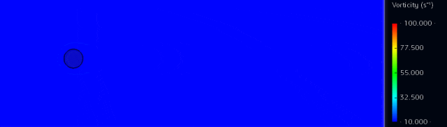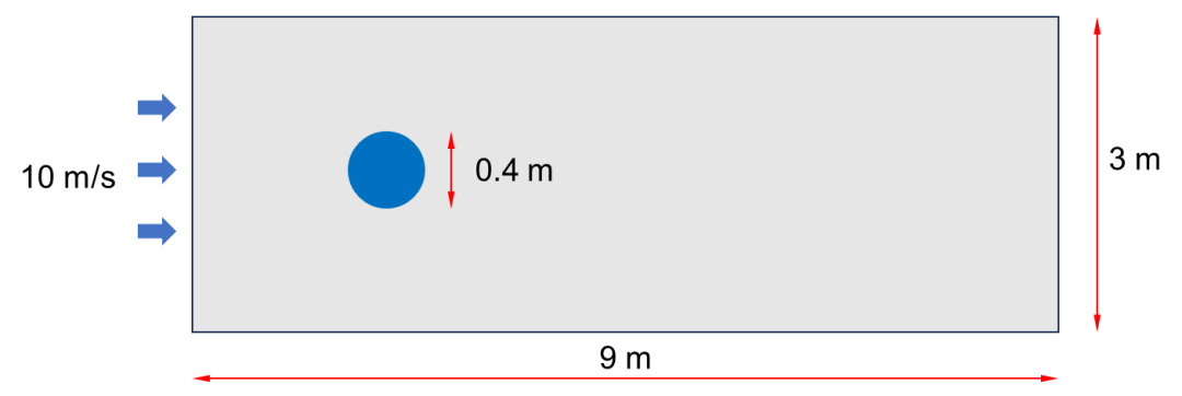 以圆柱绕流为例(老版本的官方案例,新版本该案例被取消了)。模型如下图所示,来流速度10 m/s,圆柱直径0.4 m,流体介质密度1 kg/m3,粘度0.001 Pa.s,雷诺数4000。