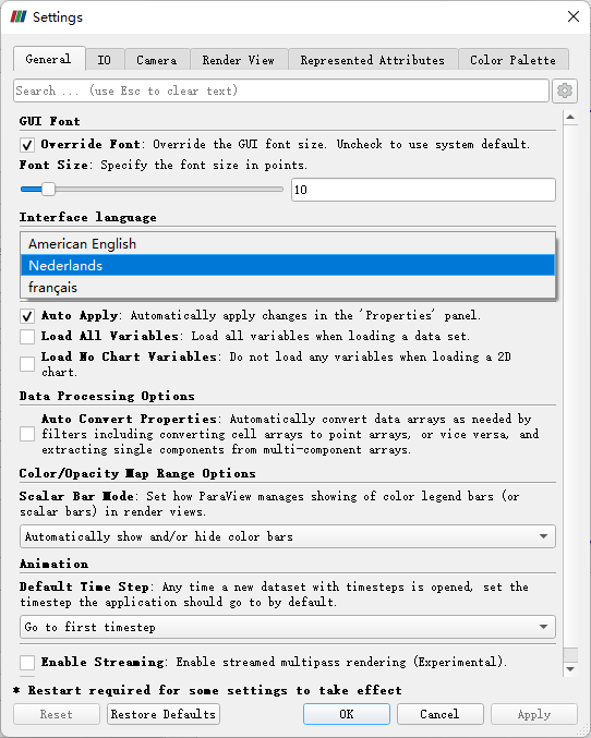 启动paraview,进入菜单 Edit → Settings… 打开设置对话框,如下图所示,可以设置 Interface language 选项,从中选择界面语言为 Nederland,点击按钮 Apply 及 OK