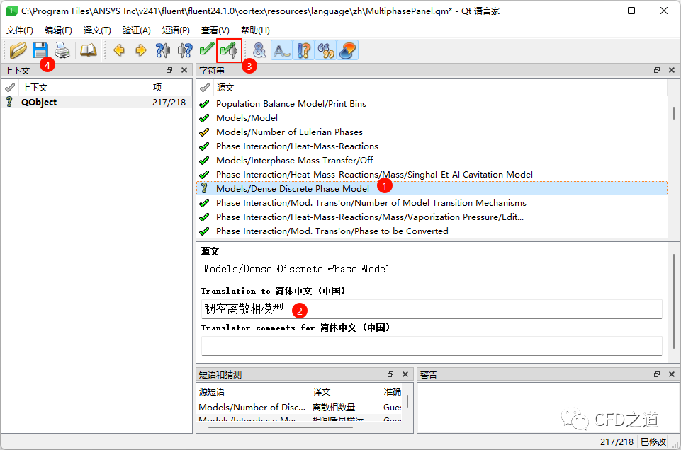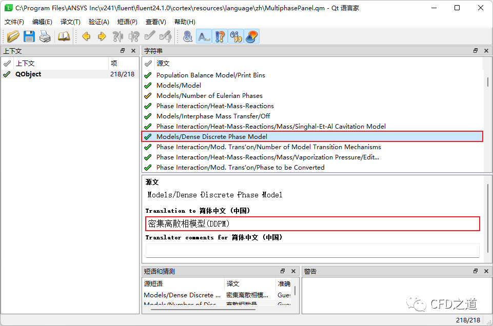 找到文件C:Program FilesANSYS Incv241fluentfluent24.1.0cortexresourceslanguagezhMultiphasePanel.qm,用linguist打开,找到条目Dense Discrete Phase Model ,如下图所示。