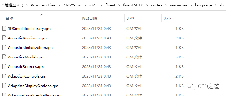 找到文件夹C:Program FilesANSYS Incv241fluentfluent24.1.0cortexresourceslanguagezh,该文件夹中包含了所有的汉化文件,共包含有545个qm文件。