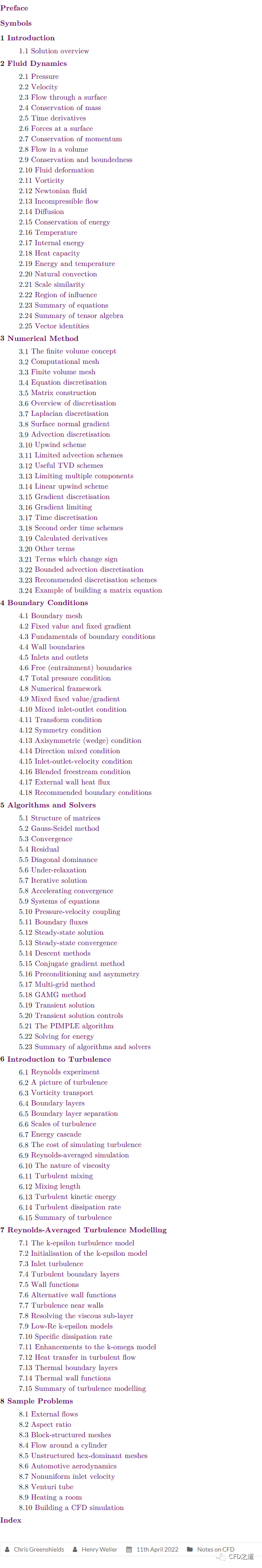这本书最大的好处是用较为通俗的方式解释CFD理论中的知识点。其主要内容如下所示。