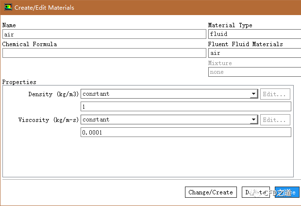 鼠标双击模型树节点Materials > fluid > air弹出设置对话框,设置其密度为1 kg/m3,粘度为0.0001 kg/m-s,如下图所示
