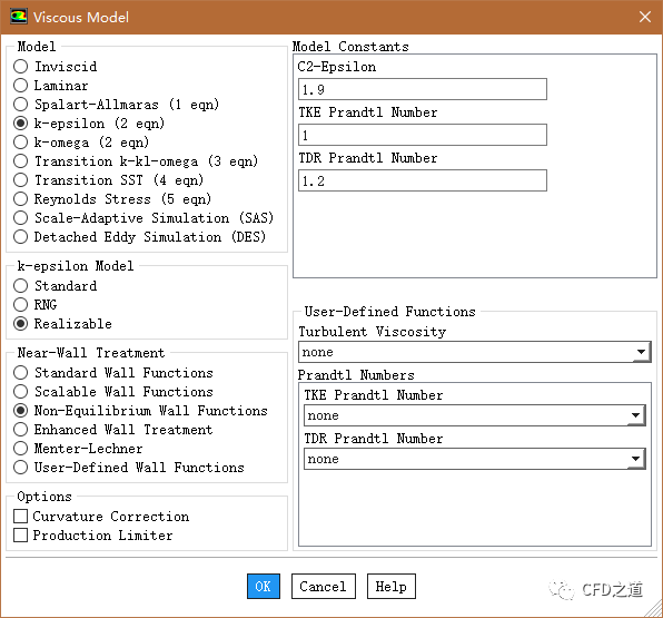 双击模型树节点Models > Viscous,弹出对话框中选用Realizable k-epsilon湍流模型,如下图所示