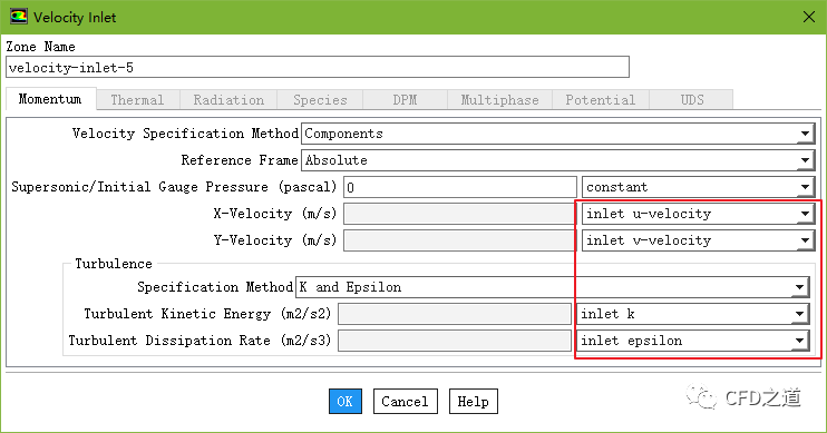 双击模型树节点Boundary Conditions > velocity-inlet-5,如下图所示设置