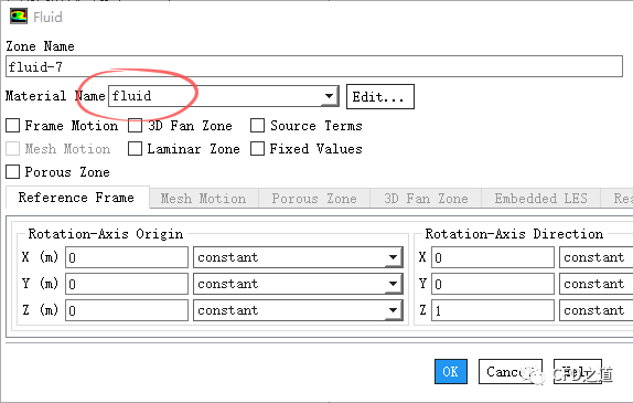 双击模型树节点Cell Zone Conditons > fluid-7,弹出对话框中设置Material Name为fluid