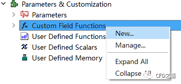 右键选择模型树节点Custom Field Function,点击弹出菜单项New…新建变量