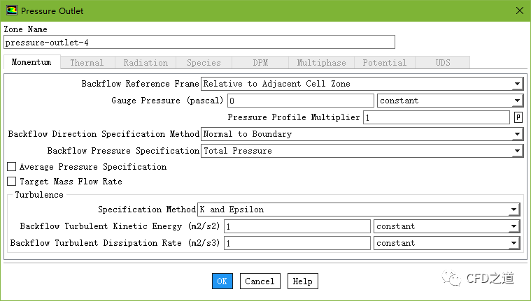 双击模型树节点Boundary Conditions > pressure-outlet-4,如下图所示设置
