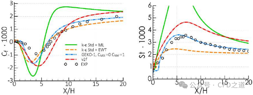 基于 且其参数的GEKO模型(简写为GEKO-1.0)显示出对和St的最佳一致性。GEKO-1.0模型是将精确转换为的模型,但子层模型除外。请注意,其他模型,如BSL/SST模型,产生的结果与GEKO非常相似。这个例子表明,与其他方法相比,基于方程的湍流模型在预测壁面剪切应力和热传递分布方面表现出色。