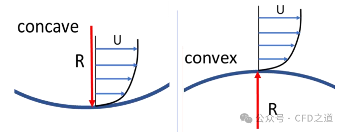 流线曲率和旋转会对湍流产生显著影响。这在图2中得到了说明,图中左侧显示的是凹壁面上的边界层,右侧是凸壁面边界层。在凹面情况下,湍流会得到增强;而在凸面情况下,湍流会被削弱。标准的涡粘模型并未考虑这种效应,因此需要增强其敏感性。曲率对旋转流的影响更大,在旋转流中,湍流通常受到强烈抑制。