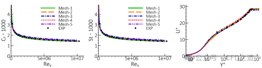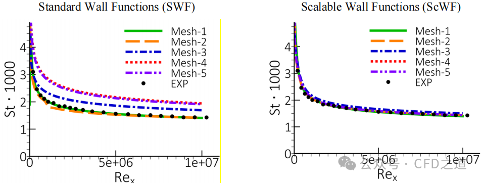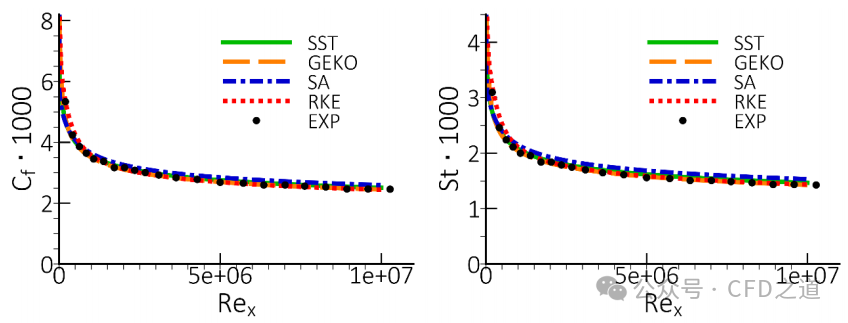 图5显示了不同湍流模型(SST、GEKO、SA和RKE)在精细网格Mesh-5上的计算结果比较。所有测试的模型在平板模拟中都表现良好,包括壁面剪切应力Cf以及壁面传热系数St。