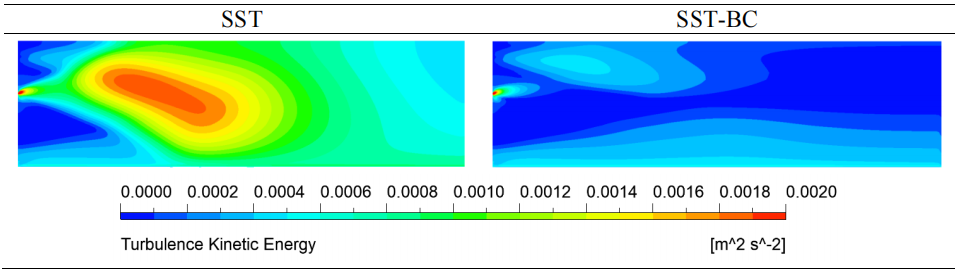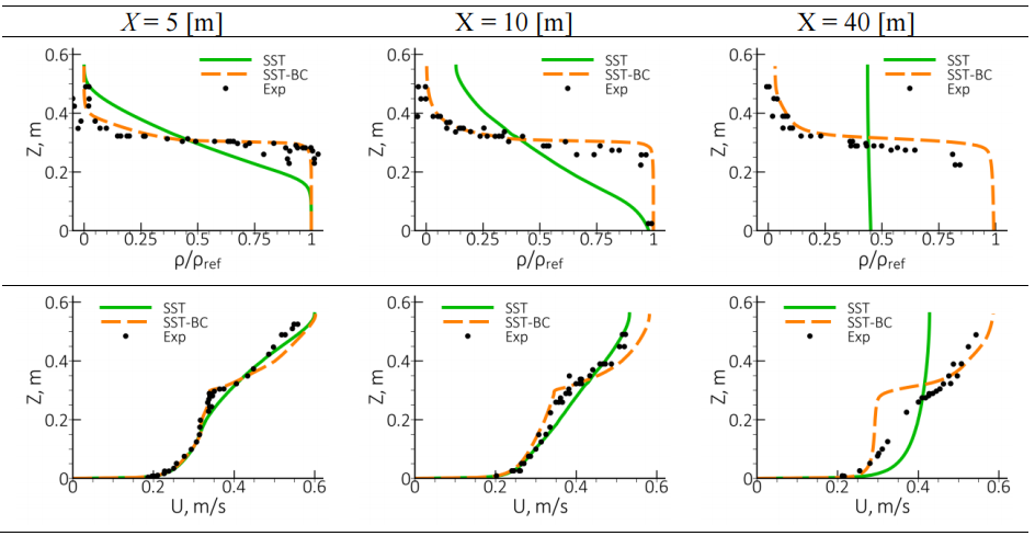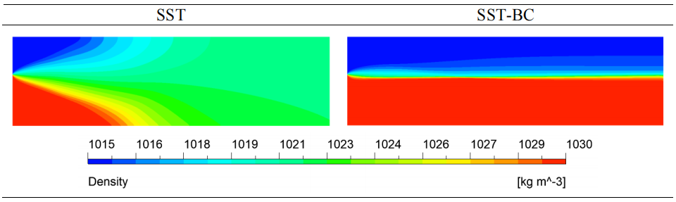 图70展示了在三个不同截面处,SST模型(无浮力修正及有浮力修正SST-BC)计算得到的密度和速度分布对比情况。X = 5 m为接近入口边界的截面,X = 40 m对应出口位置。一维密度变量计算方式为。从图71可以看出,如果不考虑浮力效应,则无法感受到密度分层的稳定化效果,两个流场的混合速率会过高。方程中的浮力产生项降低了剪切层内产生的湍流动能,如图72所示。这导致湍流粘度和雷诺应力均减少。因此混合层的发展更符合实验结果。最下游的截面X = 40 m处的计算结果表明,浮力修正对湍流施加了过强的衰减作用,从密度和速度分布缺乏混合现象可以看到。此处使用的是默认设置,并未针对模型进行精细调整。