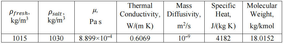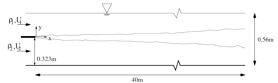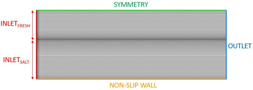 在代尔夫特水力学实验室,Uittenbogaard [51]实验研究了一种淡水与盐水流之间的稳定分层混合层流动。其装置示意图如图68所示。两种密度不同的流体通过分隔板水平进入计算域。上层为密度为1015 kg/m³、平均速度为0.52 m/s的淡水流;下层则为密度为1030 kg/m³、平均速度为0.32 m/s的盐水溶液。在CFD设置中,可以将此流动视为二维流动,如图68所示。流体介质属性在表3中给出。
