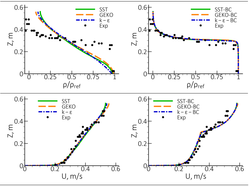 分别采用标准模型、SST模型(无浮力修正及有浮力修正)以及GEKO模型(无浮力修正及有浮力修正)进行了计算。所有案例的边界条件如下:在入口边界处,指定实验测定的速度、湍流特性以及组分浓度分布;出口边界指定为恒定压力;流体域下边界指定为无滑移壁面,上边界模拟为自由表面。