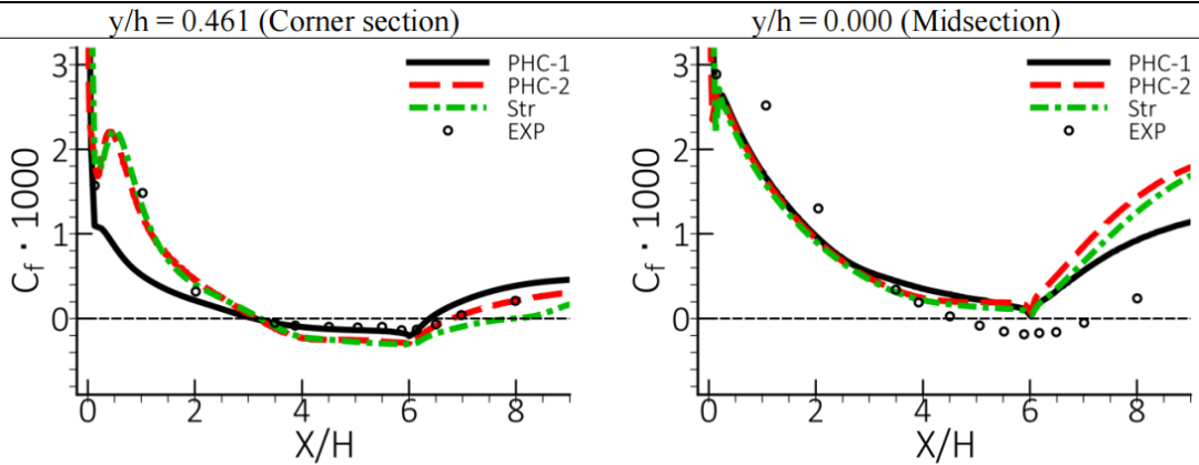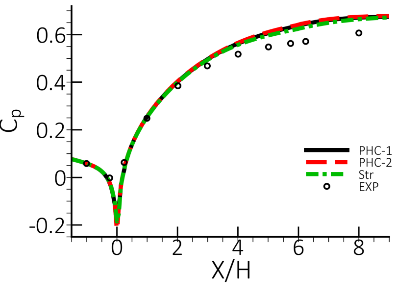 从图 93 中可以看出网格细化对转角涡结构和涡强度的影响。显然,PH-1 网格不足以求解涡流问题。图 94 显示了使用 SST-CFC 模型的两个非结构网格与结构化六面体(Str)的 DLR 扩散器倾斜壁面上的表面摩擦力预测对比。显然,转角附近的网格分辨率不仅在转角附近很重要,而且也会影响到中心区域的流动。在当前的测试案例中,对中心部分流动的影响不大,预测的压力分布(图 95)与两种非结构网格的实验数据非常吻合。但需要注意的是,转角流分离的错误预测在最坏情况下会导致不正确的流体拓扑,进而对全局流动参数产生很大影响。