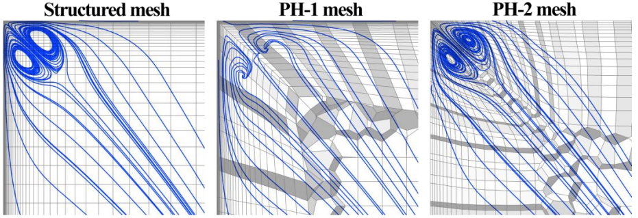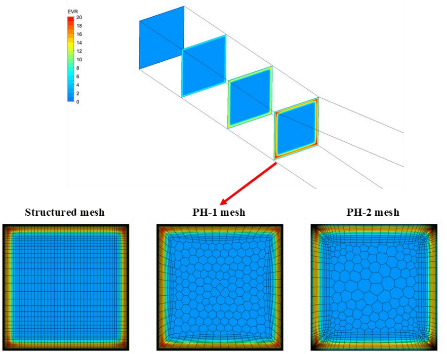 图 89 中的结构网格(Str 网格)由于其网格拓扑结构,在该区域具有足够的分辨率,而非结构网格对该区域的分辨率则难得多。图 90 和图 91 分别显示了两个非结构网格,一个未细化(PH-1),另一个细化(PH-2)到角落。图 92 显示了在网格上方绘制的涡粘比等值线。从图中可以直观地看出,PH-1 网格在转角处的分辨率不够。虽然可以将网格细化到边角(PH-2),但由于在所有方向上都要进行局部细化,因此网格数量过多。对于当前示例,网格大小在所示的两个网格之间增加了十倍 。另一个问题是,由于细化到转角,棱柱层的厚度在转角区域会缩小(图 91)。