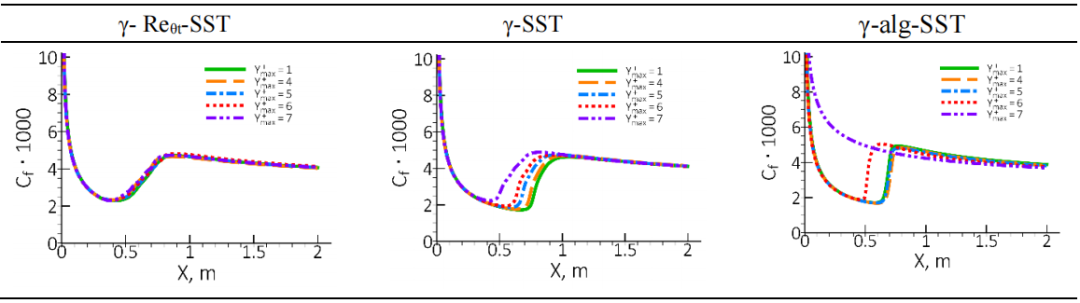 在第一层近壁面高度变化的情况下,转捩位置对转捩区域中的不敏感(见图88)。如果该区域的较高,则转捩位置会向上游移动。在对流向网格和壁面法向网格研究中发现,双方程模型(- -SST)对网格分辨率的敏感性远低于单方程间歇转捩模型(-SST)或代数间歇模型(-alg-SST),后者对网格分辨率最为敏感。
