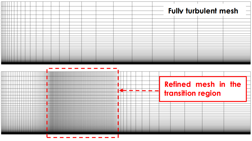 与完全湍流边界层相比,转捩边界层对网格分辨率更为敏感。完全湍流模拟的网格在转捩区域是不够的,特别是在流向方向。遗憾的是,大多数情况下,如果没有先行模拟,转捩位置是未知的。因此在使用转捩模型进行计算时,建议分为两阶段计算: