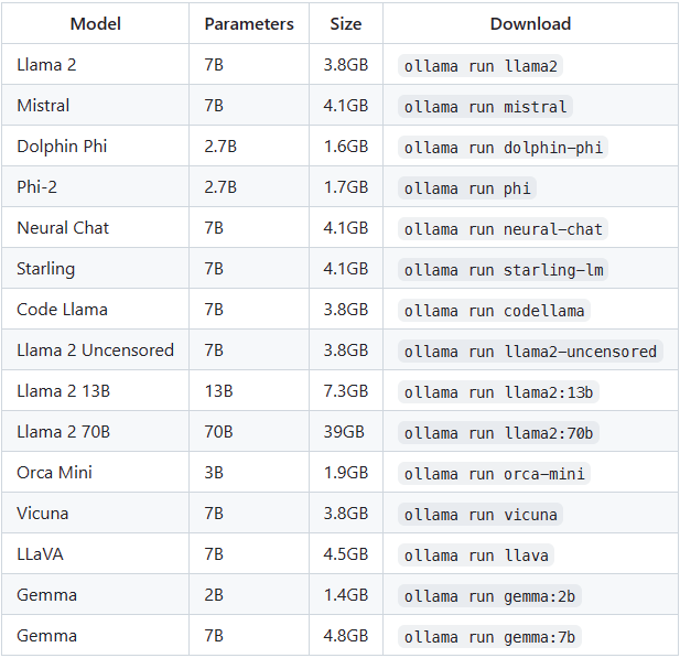 目前 Ollama 支持的一些名气比较大的模型(列表不齐全,更多的模型可以在官网查看):