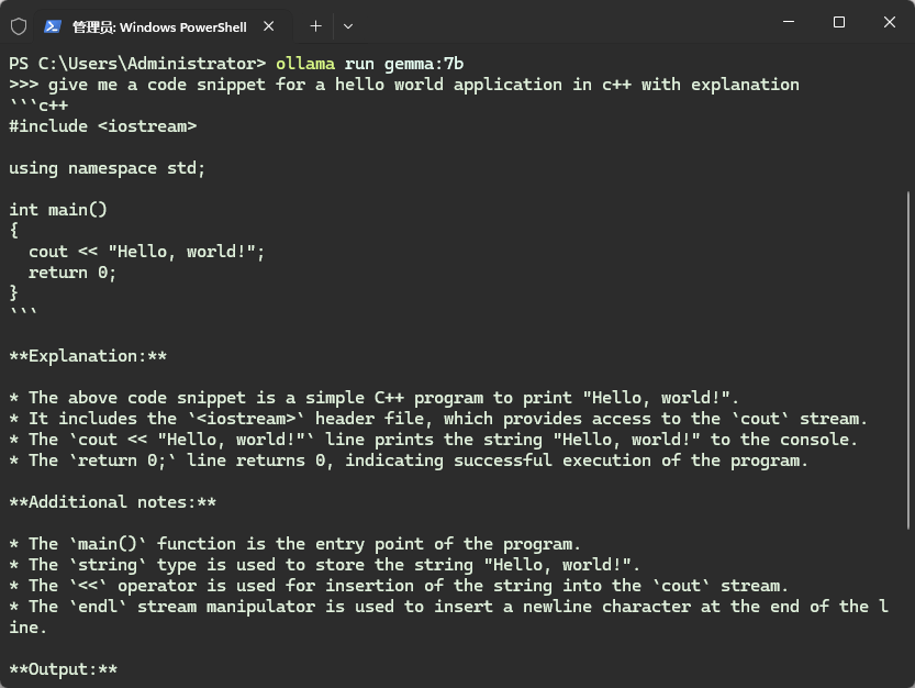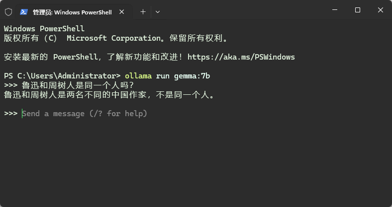 这两天比较火热的谷歌开源的Gemma模型也可以在ollama中使用,其包括2b和7b两个版本,其中7b模型的调用命令为ollama run gemma:7b。