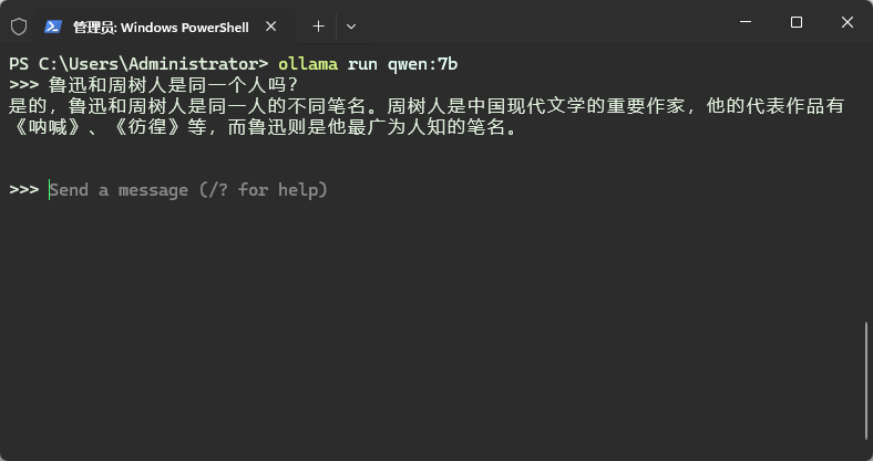 此时可以直接进行提问使用了。如下所示,能识别鲁迅和周树人,对于7b小模型来说已经很不错了。