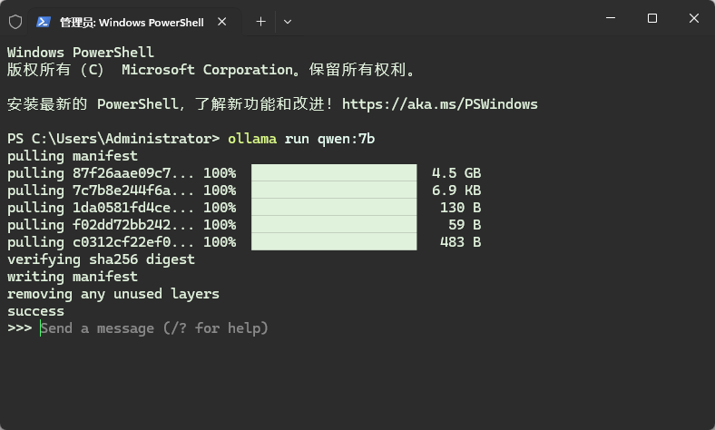 如图所示,若想要使用7b模型,可以使用命令ollama run qwen:7b